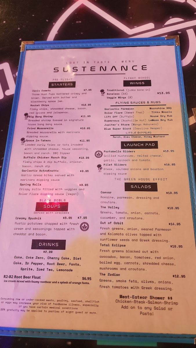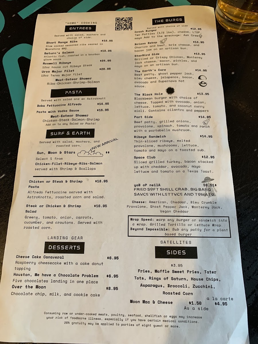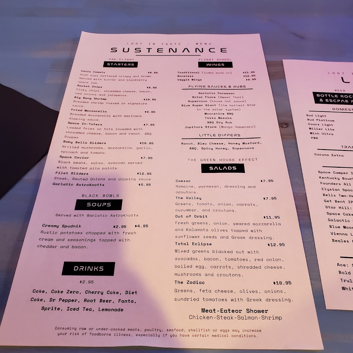 “ We were visiting the area looking for a bite to eat and boy did we pick the right place! The vibes are impeccable and the food was out of this world! (Forgive the pun, there’s a lot of them to be found here!) The loaded tater tots and fries were amazing, the chicken sandwich was one of the best, and the wings were more than we could’ve ever asked for! The staff was extremely friendly and took very good care of us, which made the experience that much better. We didn’t order alcoholic drinks, but we were definitely tempted by the fun sounding and delicious looking concoctions! The space and sports theme is one we’ve never seen before but it was so fun and unique that it will definitely have us thinking about it for a long time. We will absolutely be back soon! ”