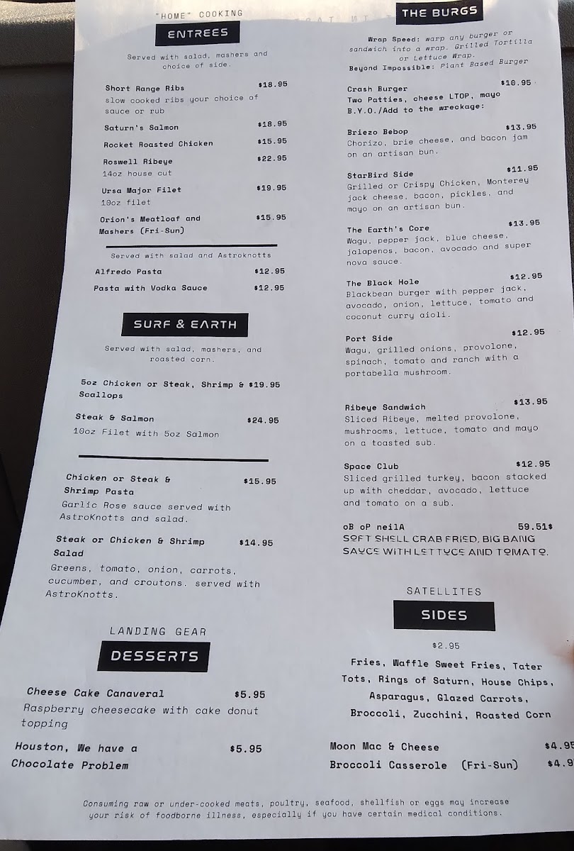 “ What a fun vibe this place has, and the tater tots were the best I've ever had; so crispy! I followed the tots with a ribeye sandwich, which was also tasty. Gotta love the quirky space-themed menu, and the service was out of this world! Miranda was very attentive and friendly. I will definitely return. ”